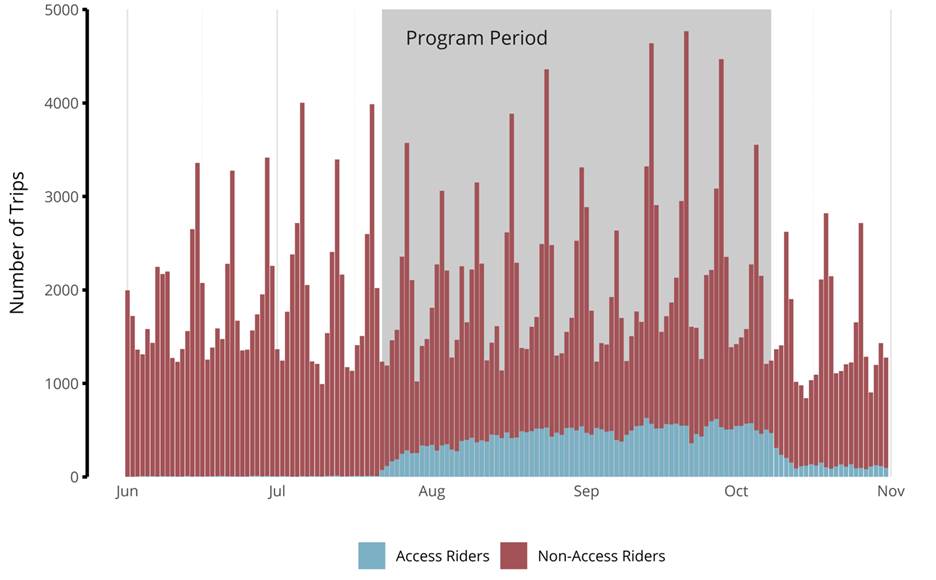 Through a statistical (differences-in-differences) analysis, we found that Access riders took an average of three more trips per week than non-Access riders during, compared to before, the pilot.