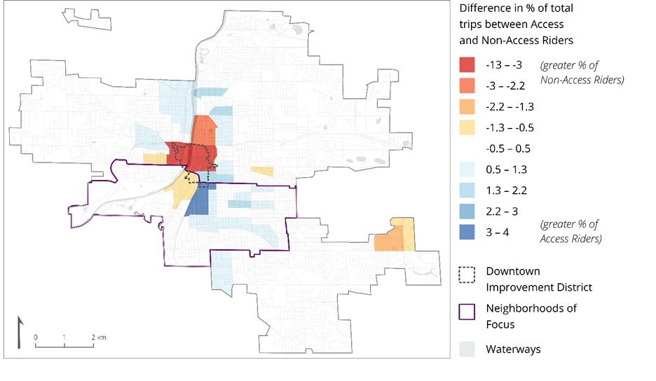 Before the pilot, when Access riders had 50% off fares, just 1% of total trips were Access trips. During the free fare program, 18% of trips were Access trips, and following the pilot, when the 50% fares returned, the proportion of discounted trips fell to 8%. The poverty rate of Grand Rapids is 18% – so, during the pilot, the proportion of free trips matched the proportion of the population experiencing poverty.
